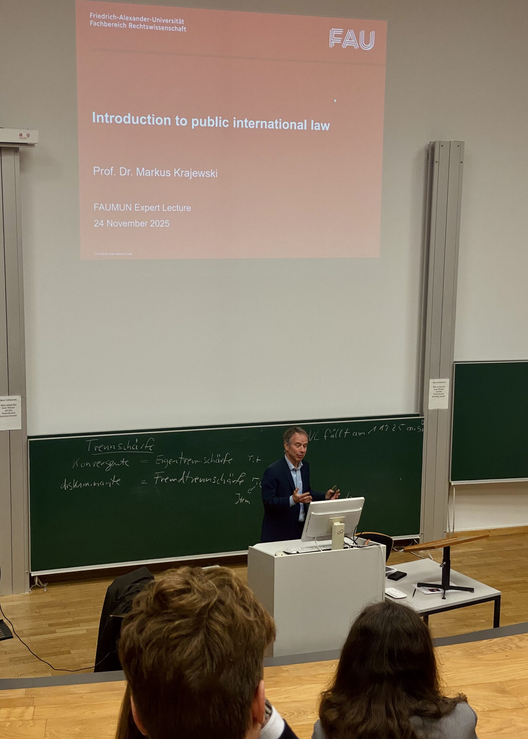 On 24 November 2025, FAUMUN had the pleasure of welcoming Prof. Dr. Markus Krajewski for an expert lecture on Public International Law. The lecture provided participants with a solid foundation for understanding the legal framework that governs relations between states, international organizations, and other actors on the global stage.